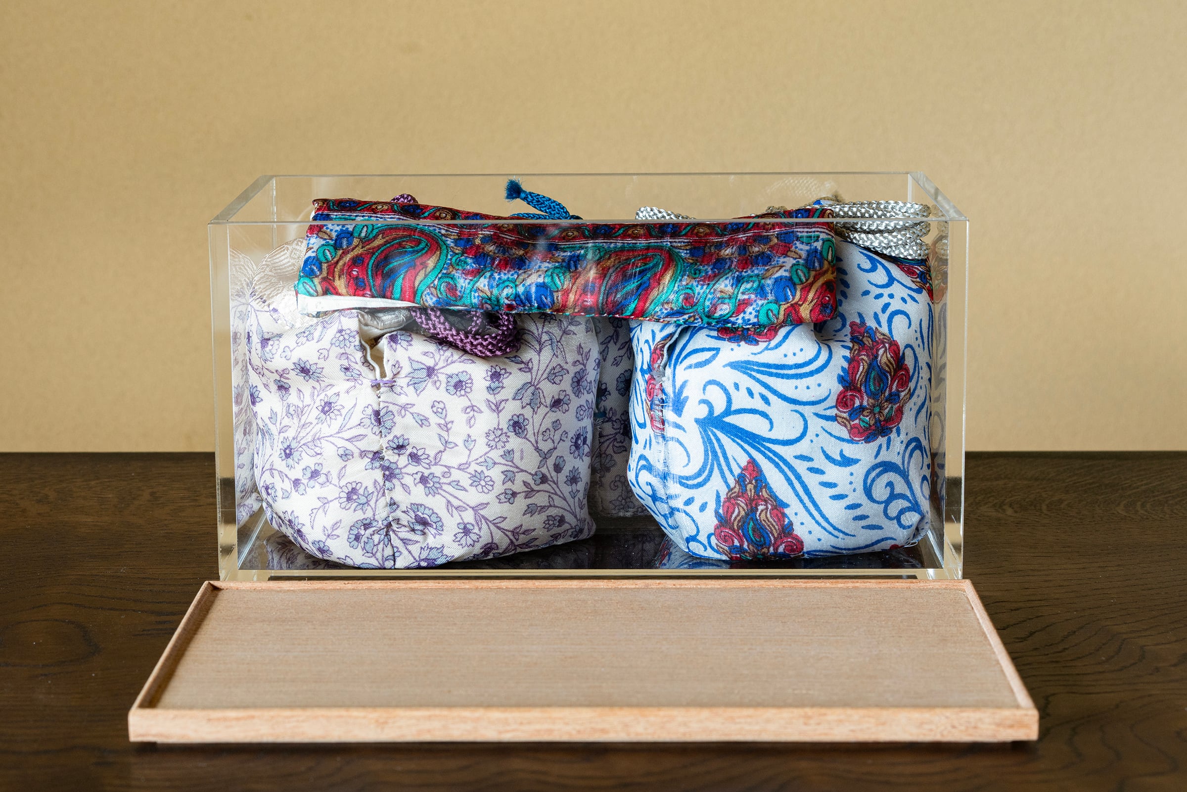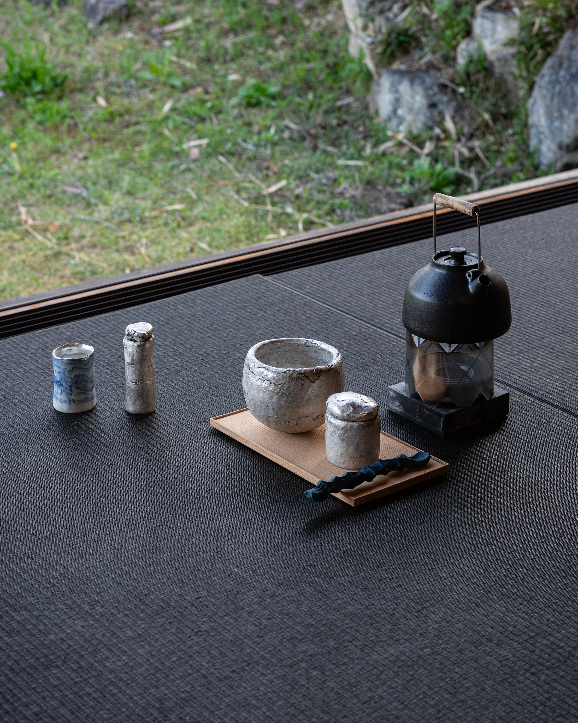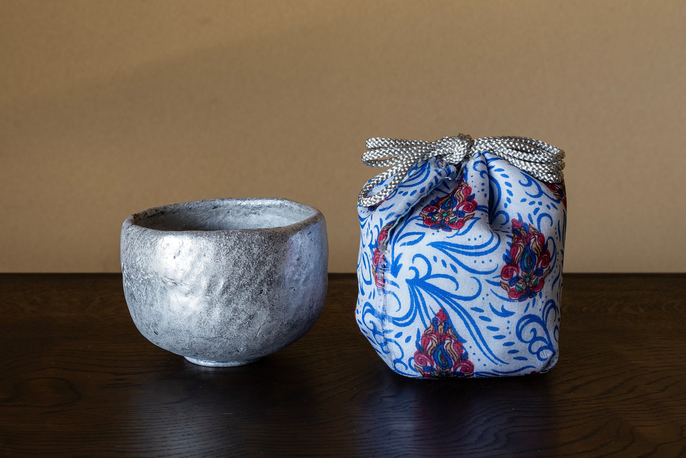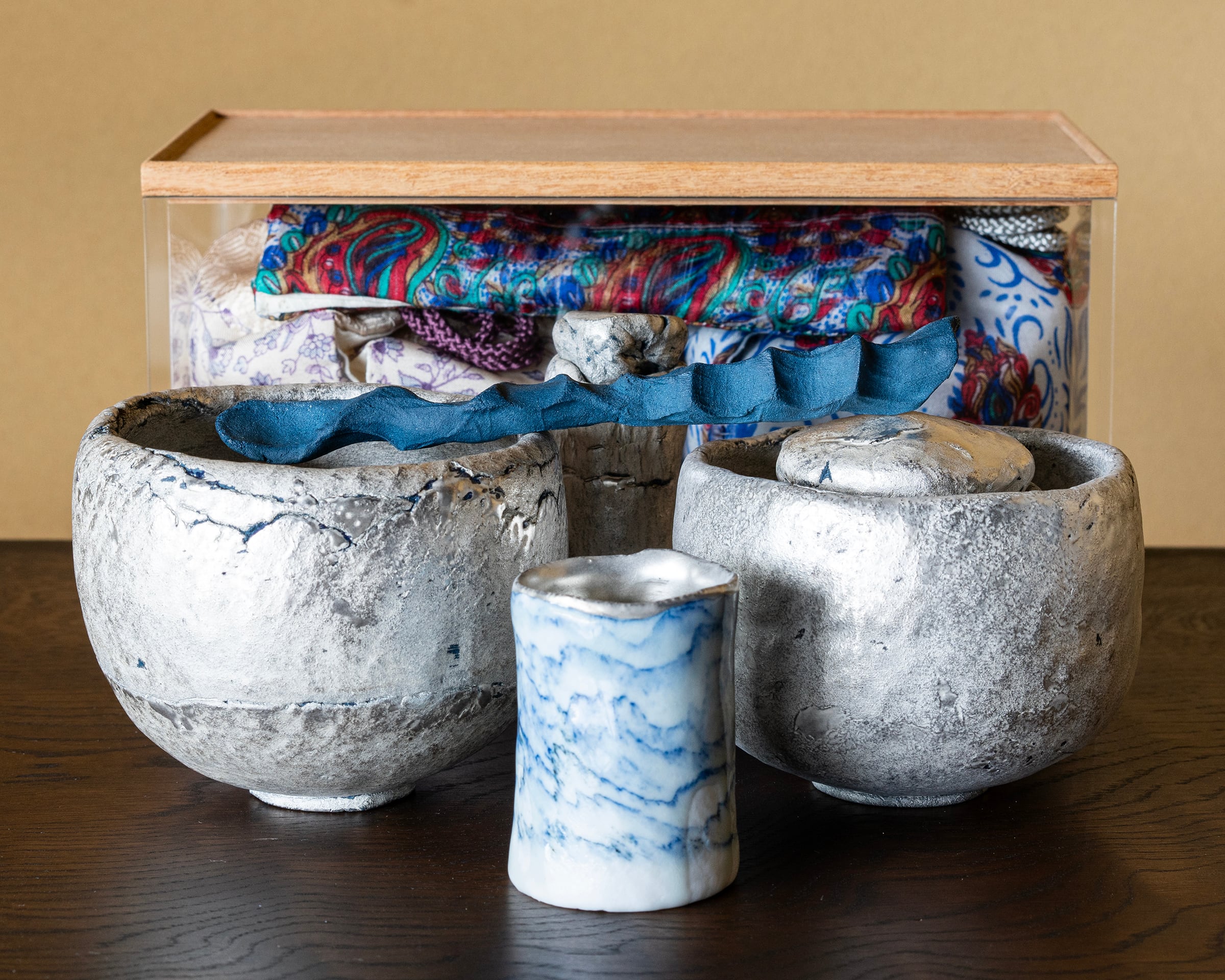 make 茶碗 CoSilver、make 茶碗 青×silver、茶器 CoSilver、蓋物 CoSilver、匙 Co、茶巾筒 染付、仕覆(裂地は中井さんが自らネパールにて求めたものです。)